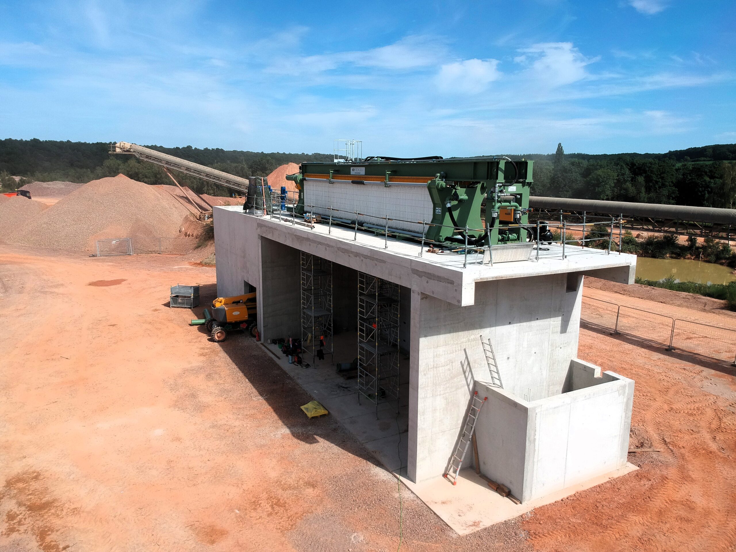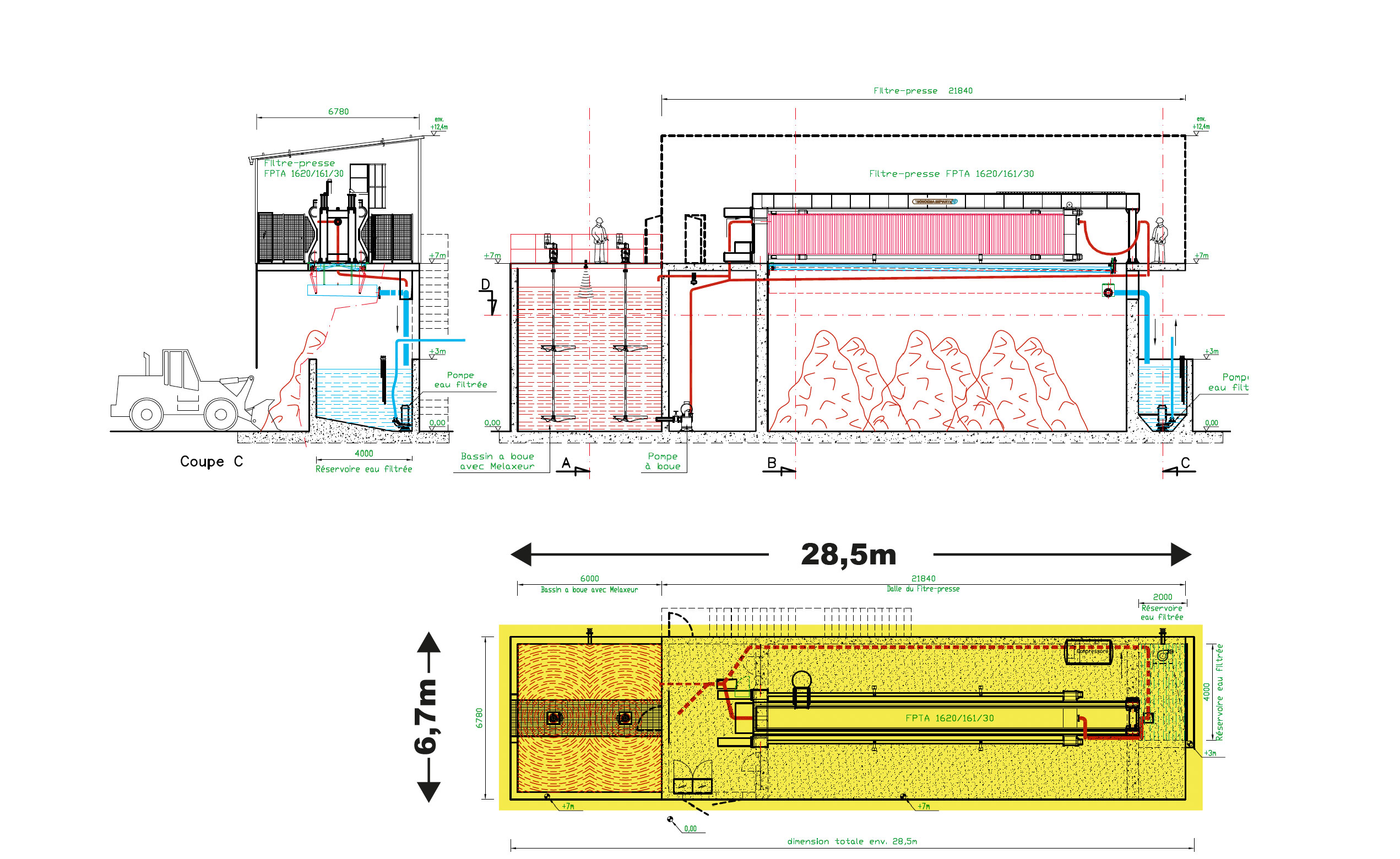 Nonostante le grandi dimensioni della filtropressa (LxWxH = 17,5 m x 2,5 m x 3 m, 60.000 kg) e di un serbatoio fanghi da 200 m³, il layout dell’impianto risulta estremamente compatto (LxWxHmax = 28 m x 7 m x 12 m).
